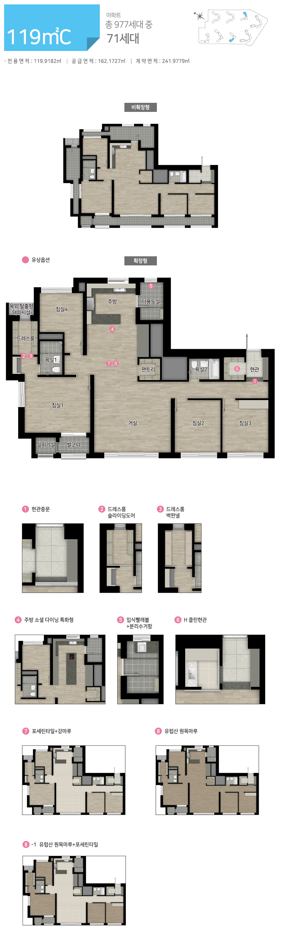 여전히 주방 공간이 협소해 보여 전체적인 발란스가 좋지 않아 보이며 그래도 평형대가 커져서인지 안방 드레스룸 공간, 복도 팬트리 등의 수납공간이 여유가 있어졌습니다.