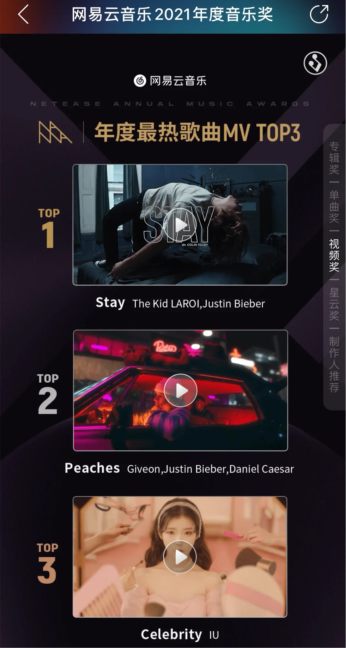 - 2021 중국 NetEasy Cloud Music 앨범차트 5위 라일락 , 뮤직 비디어 3위 Celebrity