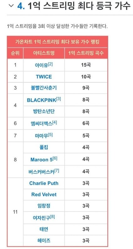 - 최다 1억 스트리밍 곡 보유 가수 - 15곡