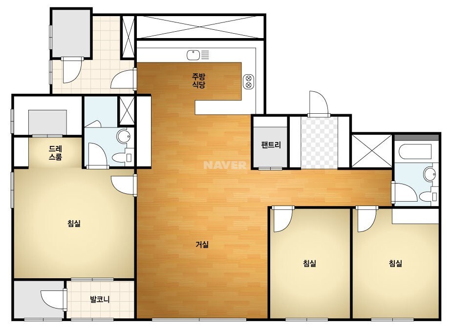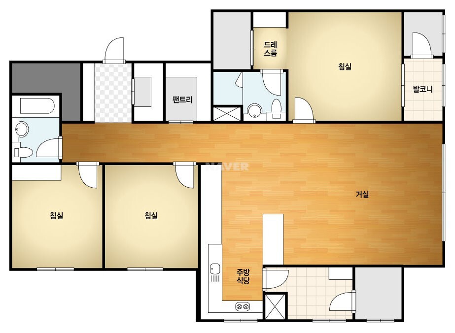그래도 현관의 구조를 한쪽 신발장,한쪽 팬트리 구성에 복도에 꽤 넉넉한 팬트리를 추가로 제공하는 등 수납공간은 잘 챙긴 것으로 보입니다. 공용욕실은 무난하고 주방/거실 또한 전형적인 타워형 타입을 따르고 있습니다. 특색 없이 무난합니다.