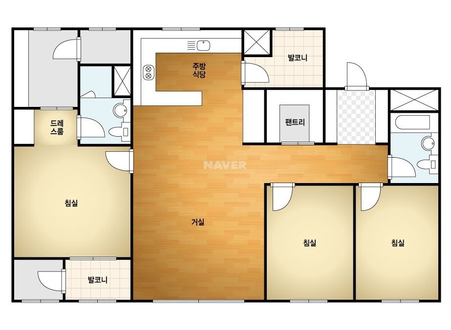 74B와 같고 공간만 조금씩 더 커졌을 뿐입니다. 역시 동 평형대 신축에 비하면 작은 드레스룸 공간, 공간활용이 애매한 다용도실 구조, 주방에 창이 없는 구조 등 단점은 모두 같습니다.