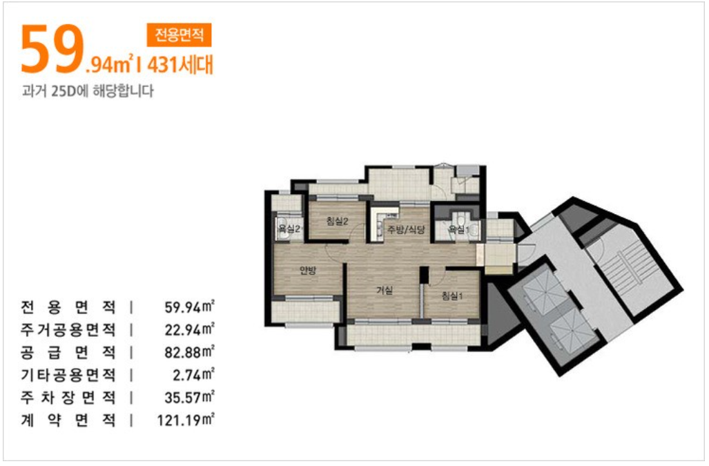3 Bay 판상형 타입으로 49A, 59A~59D Type과 타워형인 59E Type으로 구성되어 있으며 요즘 아파트처럼 4 베이에 팬트리를 제공하는 구조는 아니지만 거실이나 방의 사이즈가 대체로 크게 빠진 평면을 제공합니다. 특히 59A Type은 3면 발코니 구조로 안방과 안방 맞은편 방이 측면 발코니 확장으로 인해 상대적인 넓은 공간을 제공하며 49F Type의 경우 하늘도시에서 유일한 20평대로 넓은 안방,넓은 드레스룸, 거실, 방 1, 화장실 1로 1,2인 가구 거주에 안성맞춤인 구조이지만 세대수가 57세대로 아주 적다는 점이 아쉽습니다. 59A Type이 측면 발코니 적용으로 좀 다를 뿐 나머지 59 Type은 비슷비슷합니다. 특이하게도 요즘 아파트와 달리 허가 날 때 영종도 1기 아파트 소형평수는 안방 발코니 확장이 하용되어 하늘도시 1기 아파트 20평대는 전부 안방 발코니가 확장되어 있습니다. 안방을 더 넓게 쓰시려는 분들은 좋겠지만 발코니를 선호하는 분들도 있어 호불호가 있을 것 같습니다.
