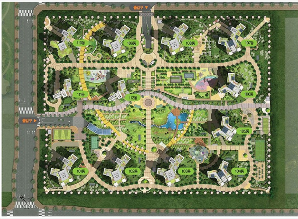 아래 단지배치도의 110번대는 하늘도시 단지별 동호수 부여 규칙에 따라 820번대로 변경되었습니다.