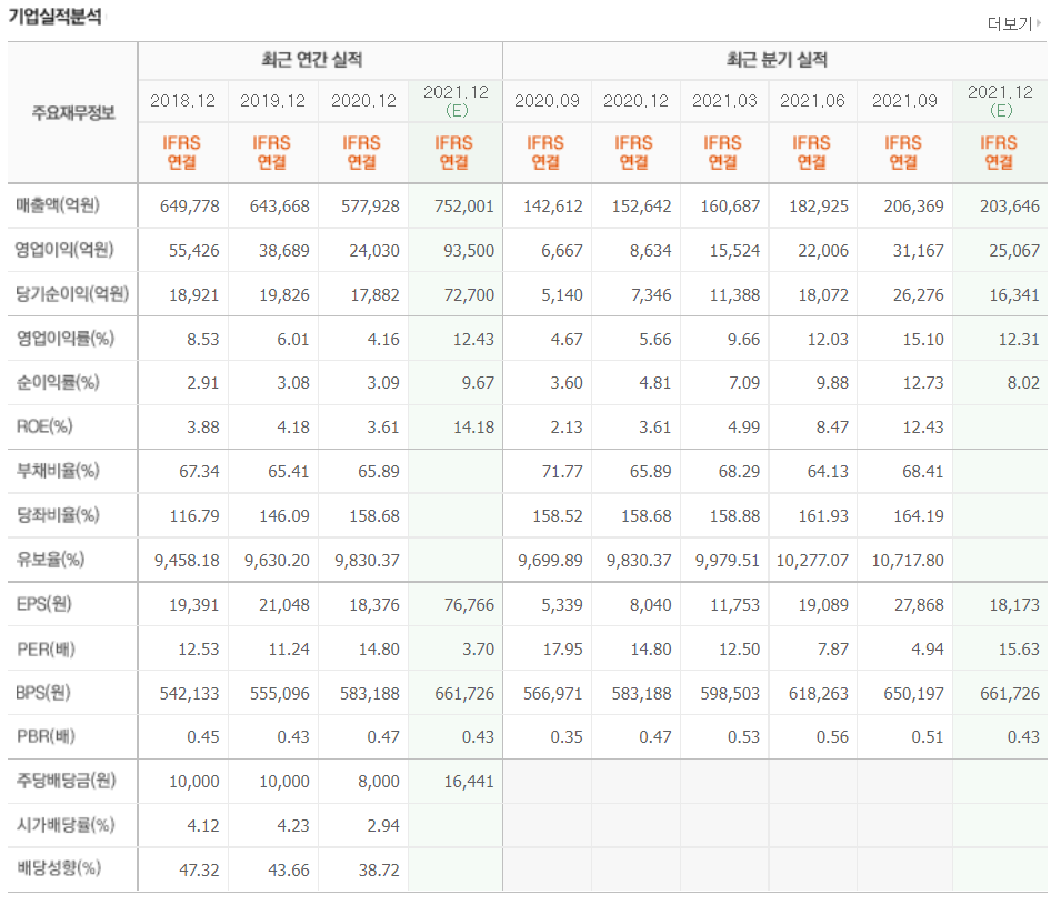 27,768원이다. 이미 1,2,3 분기 배당을 통해서 12000원을 지급하였기 떄문에 이번 4분기 예상 배당액은 15000원 정도이다. 현 주가로 계산하면 4분기 결산 배당액만 배당 수익률이 5%에 이른다. 3분기 실적발표 콘퍼런스 콜에서도 역대급 배당을 할 수 있을 것 같다고 했으니 불가능한 건 아닐 듯 하긴 한데 정말 높은 숫자이다. 이는 일부 희망 회로를 돌려서 조금 높게 잡은 것으로 이번 배당액이 12000원 정도만 돼도 이례적인 높은 배당금이며 올해에 워낙 철강경기가 좋았지만 내년에도 철강경기는 그런대로 좋을 것이라는 시장의 예상대로라면 내년에 예상되는 배당 수익률은 무려 9% 이상를 가리키게 된다.