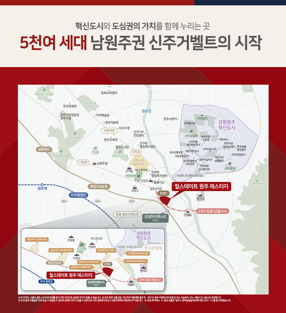 힐스테이트 원주 레스티지 아파트는 강원도 원주시 관설동 1361-8번지 일원에 들어서며 지하 2층~지상 18층, 13개 동 규모의 전용면적 84m2 이상 중대형 세대로 구성된 총 957세대 중대형 단지입니다.