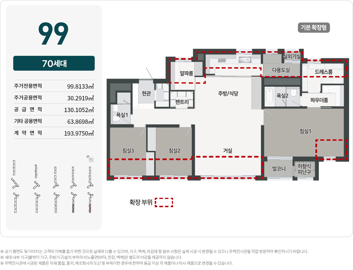 평형대에 맞게 주방 / 다이닝 공간이 아주 넓게 빠졌습니다. 알파룸 공간은 온전한 방으로써의 공간으로 쓰기에는 무리가 있어 보이며 대형 수납공간 / 팬트리 공간으로 사용하면 좋을 것 같습니다. 알파룸 앞에 팬트리를 없애고 알파룸을 확장하였으면 온전한 방하나가 될 것 같은데 필요한 분들은 옵션 혹은 간단한 공사를 통해 변경이 가능할 것 같습니다.