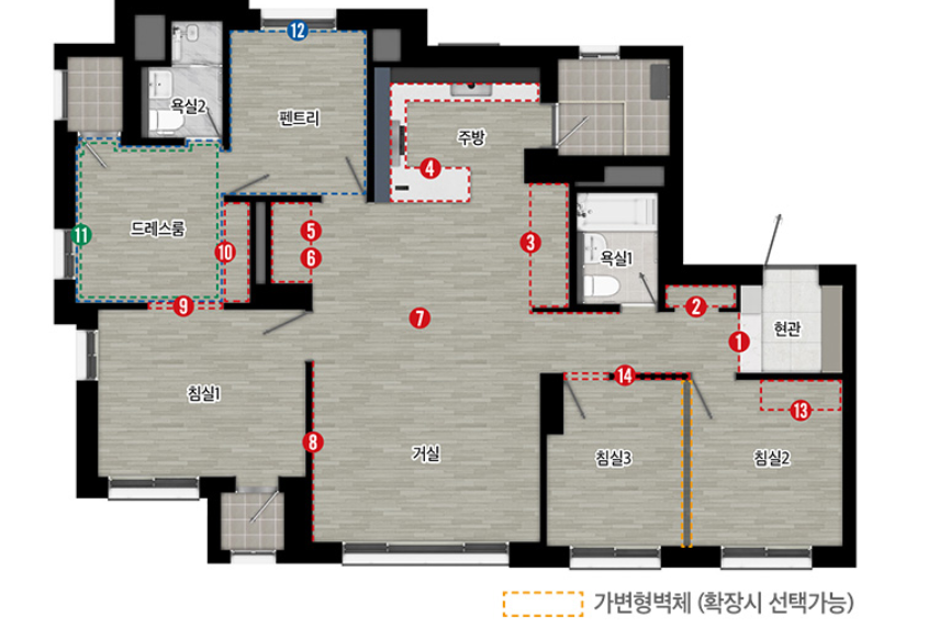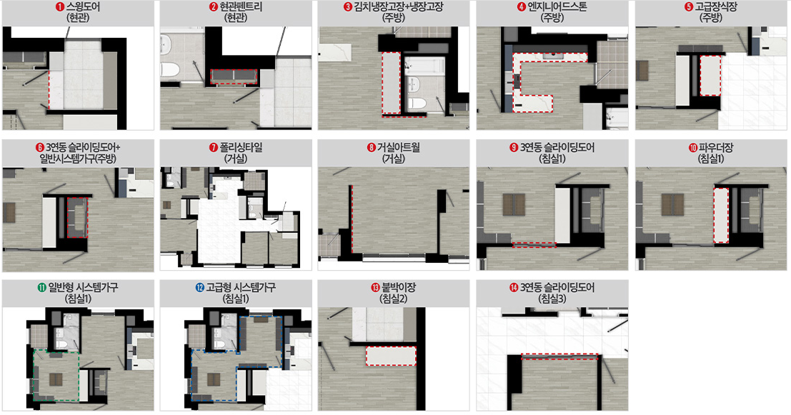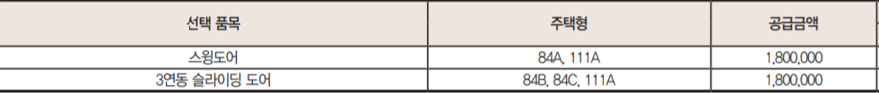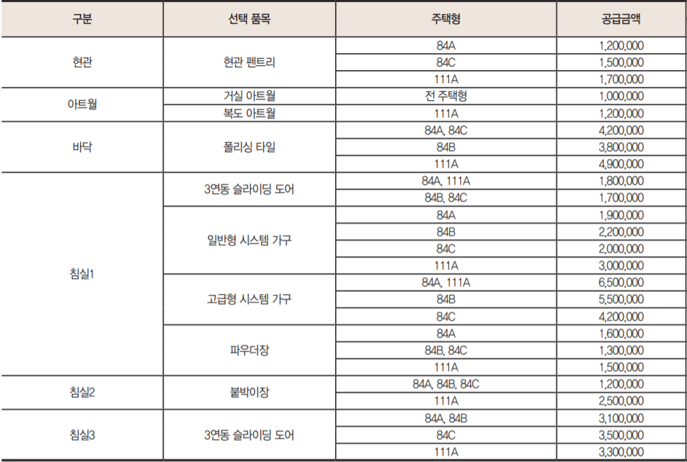 84A Type 중문/가구/마감재 관련하여 아래와 같이 14개의 옵션이 있습니다. 인테리어의 통일성을 해치지 않는 측면에서 현관 중문,현관 팬트리, 침실 붙박이장은 그 금액을 볼 때 일반적인 시공업자들이 시공하는 비용보다 많이 비싸다고 판되어 옵션으로 선택하지 않고 입주 시 따로 하는 것을 추천합니다. 중문같은 경우 따로하는 경우시공업자/모델에 따라 다르지만 백만원 초반대에 시공이 가능합니다. 붙박이장도 마찬가지입니다. 나머지 마감재 관련해서는 인테리어의 호불호 측면에서 선택하면 될 것 같고 드레스룸이나 알파룸은 매매를 고려하고 룸의 활용도(예를 들어 드레스룸을 서재로 쓰겠다고 하면 옵션이 필요 없겠지요.)를 고려하여 선택하시면 됩니다. 침실 3의 3 연동 슬라이드 도어 같은 것은 인테리어 효과가 얼마나 좋을지 모르겠으나 비용이 너무 과해 보입니다.