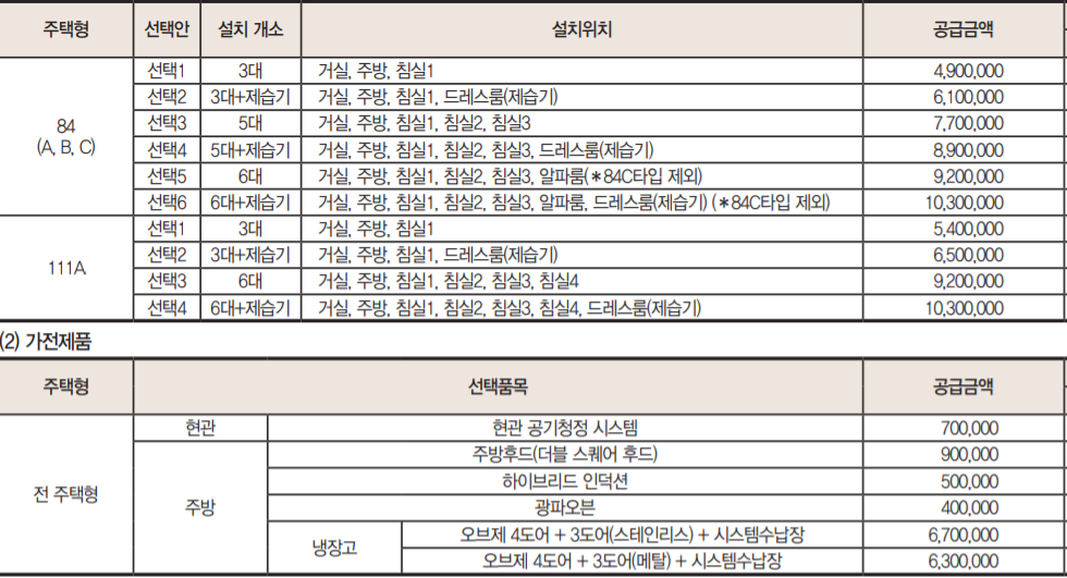 84A Type 에어콘/가전 옵션은 일단 시스템 에어컨 관련하여 아래와 같이 6개의 선택 옵션이 있으며 가전제품 관련 6개의 옵션이 있습니다. 시스템 에어컨은 최근 추세로 볼 때 매매의 편의-거래가 훨씬 더 잘됩니다.-때문에 많은 이들이 필수적으로 선택하는 옵션입니다. 요즘은 시공업자가 잘 하긴 하지만 마감이 다 된 곳을 따로 시스템 에어컨 설치한다고 다 뜯으면 아무래도 RISK가 있어 시공의 통일성을 볼 때 필수적으로 선택해야 하지 않나 생각됩니다. 거의 하나의 방 크기 수준으로 나온 드레스룸과 알파룸의 활용도에 따라서 선택 3, 선택 5를 하면 될 것 같고 제습기 옵션은 선택하면 시스템 에어컨에 내장되어 깔끔하지만 김포가 섬 지역이 아니라 개인적으로 큰 필요성을 못 느끼며 필요하다면 따로 구매하셔도 될 것 같습니다.