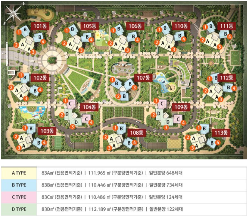 총 13개 동으로 구성되었으며 용적률이 다소 높은 고밀도 아파트이지만 건폐율이 아주 낮아 동 간 거리가 넉넉하여 일조권을 침해받는 저층이 생각보다 적습니다. 아래 그림에서 동 표기가 100번대로 표기되었는데 하늘도시 동호수 표기 규칙에 의거 100번대가 900번대로 변경되었습니다. 현재 전면동 중층 이상은 바로 앞바다까지 확 뚫려있어 바다 조망이 가능하지만 곧 분양하는 정면 건너편 주상복합 부지에 고층 주상복합이 들어서면 상당 부분 바다 조망을 잃게 됩니다. 하늘도시는 바다가 가까이 있지만 영구 바다조망이 되는 아파트는 생각보다 적습니다. 단지 내에 단지를 한 바퀴 둘러싼 도로 수준의 차도가 있는 게 조금은 아쉽습니다. 아파트 조경 시설은 무난한 편입니다. 현대라는 건설사 브랜드답게 조금 우직하다고나 할까요.