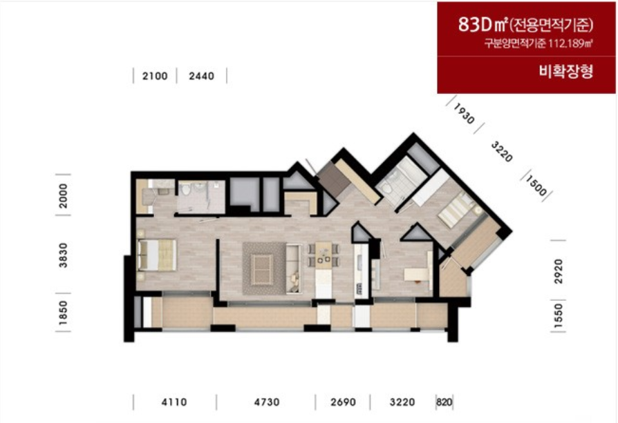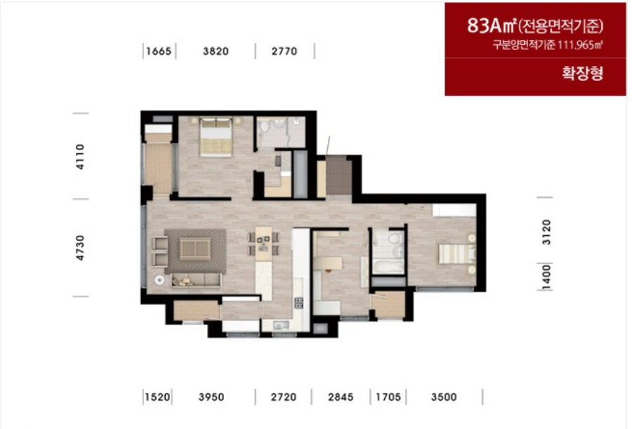 LDK구조의 타워형 Type과 3 Bay 판상형 타입, 약간 변형된 구조의 4 Bay Type으로 구성되어 있으며 요즘 아파트처럼 4 베이에 팬트리를 제공하는 구조는 아니지만 거실이나 방의 사이즈가 대체로 크게 빠진 평면을 제공합니다. 요즘 분양하는 아파트가 보통 거실폭이 4 m50, 안방 폭이 3 m60인데 당시 분양하는 아파트답게 거실폭과 안방 폭이 넓게 나온 것을 확인할 수 있습니다. 확장을 하면 침실 3의 길이가 4m50를 넘어 요즘 아파트들에서는 찾기 힘든 길이를 보여줍니다. 폭도 3.5m 가까이 되어 타 아파트 대비 방의 크기가 크게 나온 특징이 있습니다. 특이하게 전용면적이 동일 평형 아파트보다 약 1m 2로 작게 나왔으며 일부는 발코니 공간에 반영되어 있습니다. 가뜩이나 서비스 면적이 적게 나온 평면인데 서비스면적을 전용면적이 차지하는 상황입니다. 다만 그 면적이 수치상의 면적일 뿐 실제로는 나무랄 데 없이 넉넉한 공간을 제공합니다. 특이하게 세탁실을 안방 발코니 공간으로 마련한 특징이 있습니다.