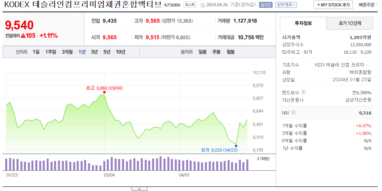 KODEX 테슬라인컴프리미엄채권혼합 ETF는 삼성자산운용이 2024년 1월말에 상장한 월 배당 ETF입니다. 국내 채권 70%를 베이스로 나머지 30%는 테슬라종목 투자 및 옵션 매도 프리미엄(커버드콜) 전략을 통해 연 15%(월 1.25%)의 분배금을 꾸준하게 지급하는 운용을 목표로 합니다.