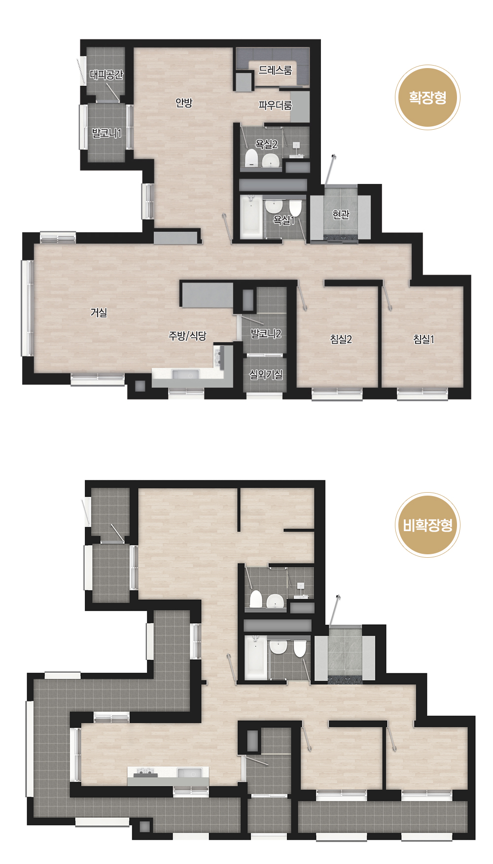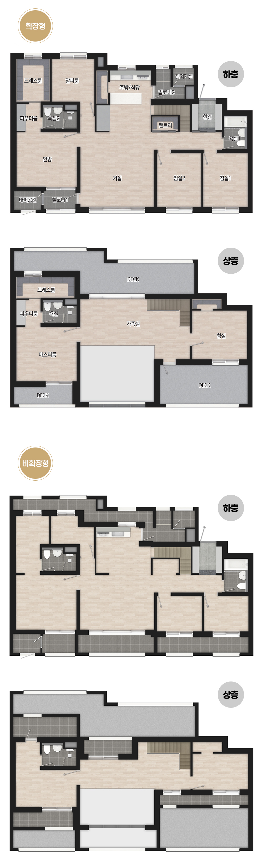 돈과 당첨 확률이 문제이지 평면에 대해서 언급할 필요가 없을 것 같습니다. 무엇보다 DECK로 표현된 야외 공간이 부럽습니다. 단지 배치도에서 어느 동에 위치하는지 표기가 안되어 있는데 아마도 전면동 최상층이지 않을까 싶습니다. 거실이 상하층 오픈된 구조네요. 공간감이 상당할 것 같습니다. 큰 평수임에도 현관 팬트리가 적용돼 않은 점이 아쉽고 화장실이 평형대에 비해 다소 초라해 보입니다. 월풀욕조 정도는 적용해야 하지 않나 싶습니다.