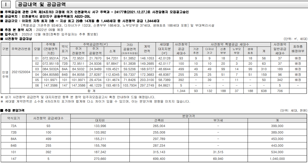 검단 중흥S클래스 AB20-2BL 아파트는 72A, 72B Type(29~30평형)과 84A , 84B Type (33~34평형), 그리고 101 Type (38평형) , 펜트하우스 세대 147 Type (58평형)의 중대형으로 구성되어 있으며 이번 사전청약의 배정 물량은 아래와 같습니다.