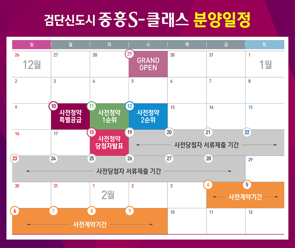 검단 중흥S클래스 중흥S클래스 AB20-2BL 아파트의 본 청약시기는 2022년 9월 예정이고 입주 예정일은 2025년 12월입니다. 사전 청약 입주자 모집공고일은 12.29(수) 일 발표되었으며 청약일정은 아래와 같습니다.