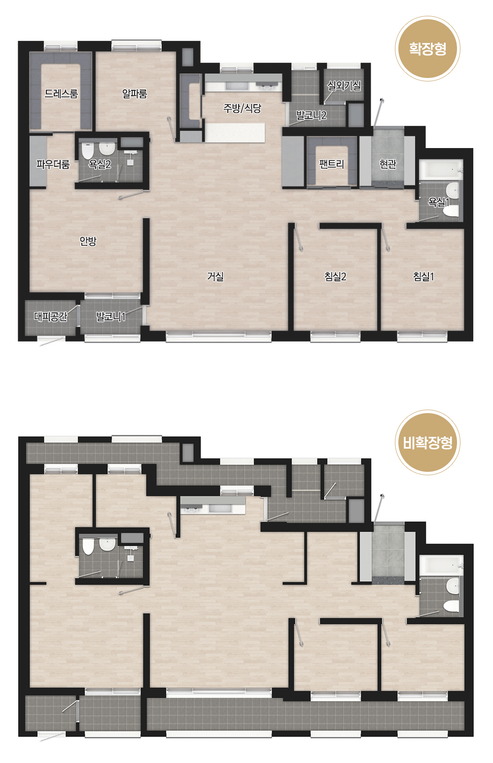 평수가 넓어진 덕에 제대로 된 방 크기를 가진 알파룸이 나왔고 드레스룸의 길이도 길어졌습니다. 84A에 언급하였듯이 현관에 양쪽 신발장 대신 한쪽에는 현관 펜트리로 나왔으면 하는 아쉬움이 있습니다. 아마도 옵션으로 나오지 않을까 생각됩니다. 평면도 상으로 볼 때 평형대에 비해 주방이 너무 작게 나온 게 아닌가 하는 아쉬움이 있습니다.