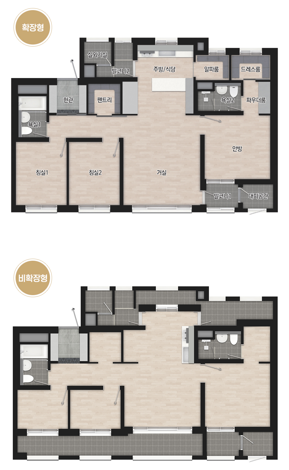 평면도상 알파룸으로 표기된 곳은 주방 팬트리로 보아야 할 것 같으며 일반적인 4 Bay 판상형에 비해 드레스룸의 길이가 짧게 나온 듯합니다. 상대적으로 드레스룸 크기가 작아 본 청약 시 알파룸과 드레스룸을 합치는 옵션이 있을 것 같기도 합니다. 주방 창의 크기도 넉넉하여 맞통풍 환기에 유리해 보입니다.