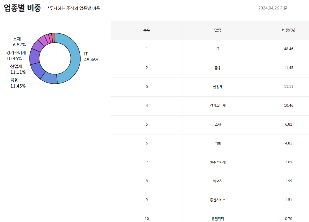 업종별 비중을 보면 IT 관련 종목에 거의 50%를 담고 있으며 나머지 소재, 소비재, 산업재, 금융에 10% 안팎 골고루 담고 있습니다.