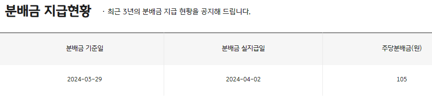 2024년 2월 상장 후 지금까지 매월말 정확하게 월 1% 수준의 분배금이 꾸준하게 지급되고 있습니다. 3월 29일 105원, 4월 26일 103원이 책정되어 지급 예정입니다.