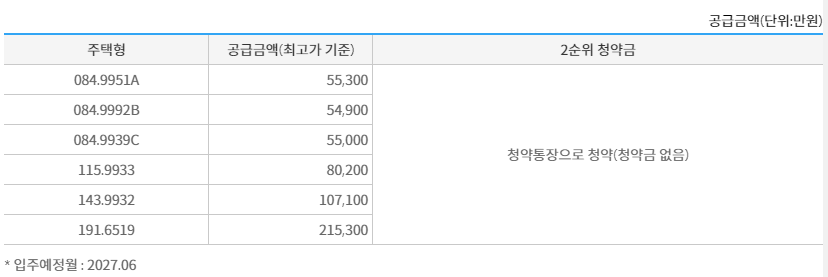 전용면적 84m2 기준 분양가는 약 5억 5천만원으로 계약금 10%, 중도금 60%, 잔금 30% 납부조건입니다. 계약금은 `1차와 2차로 나뉘어서 납부되며 중도금은 전액 건설사 알선으로 무이자 조건으로 대출 가능합니다. 발코니 확장비용은 84m2 기준 약 1600만 원 선으로 일반적인 수준이며 옵션, 취등록세 등 부대비용을 감안하면 입주까지 총 6억 1천만~6억 2천만 원 정도가 소요될 것으로 보입니다.