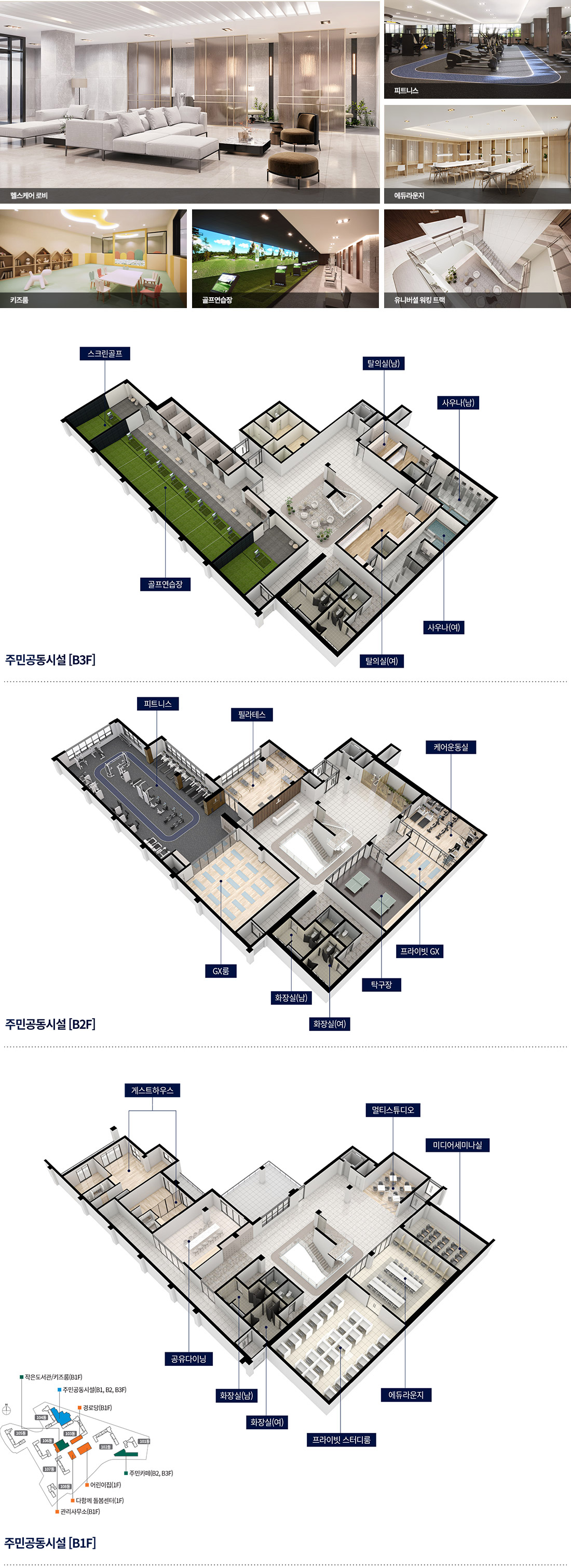 대단지이며 외부 투자자 유인을 위한 별장 아파트 콘셉트를 가져서인지 다양한 커뮤니티 시설을 제공합니다. 일반적인 피트니스 클럽, 스크린골프, GX클럽, 독서실등의 기본적인 커뮤니티 시설 외에 남녀 사우나, 필라테스, 프라이빗 GX, 케어운동실, 멀티스튜디오, 게스트하우스 등 다양한 커뮤니티 특화시설을 보여주고 있습니다. 이 정도 규모에 별장 콘셉트이라고 한다면 운영을 위한 관리비 부담도 있지만 4 레인 규모의 수영장 특화를 제공하는 것이 더 좋지 않았을까?' 하는 생각도 가져봅니다.