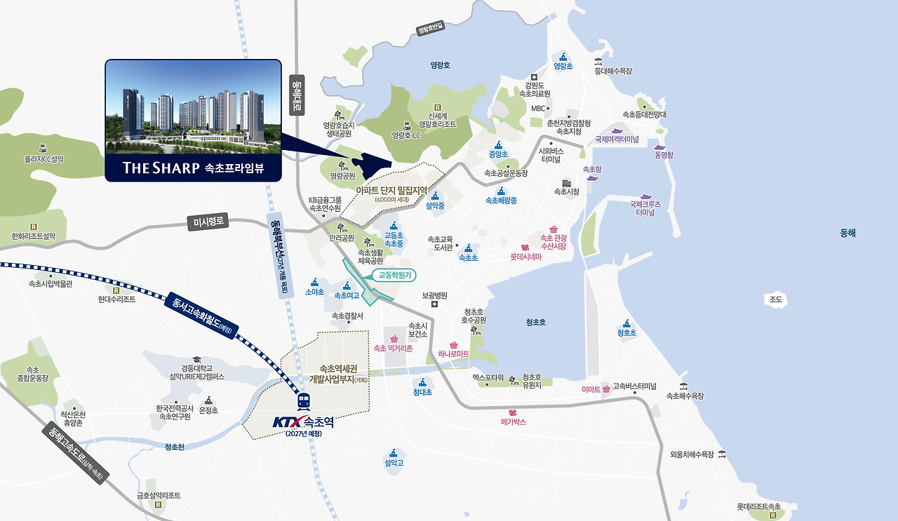 더샆 속초프라임뷰 아파트는 강원도 속초시 금호동 617-21번지 일원에 들어서며 지하 4층~지상 33층으로 건설되는 8개 동 규모의 전용면적 84m2이상 중대형 평형 세대로 구성된 총 1024세대 대단지 아파트입니다. 용적률 300% , 건폐율 17% 로 용적률이 다소 높아 일반적인 건폐율임에도 다소 밀집된 모습을 보여줄 것으로 보이나 영랑 공원민간특례 조성사업으로 진행이 되어 바로 앞 영랑호 조망과 함께 영랑 공원 속 전원 아파트로 아주 자연 친화적인 단지가 될 것으로 보입니다. 주차대수는 1474대로 세대당 1.43:1로 평형대 대비 괜찮은 편입니다.
