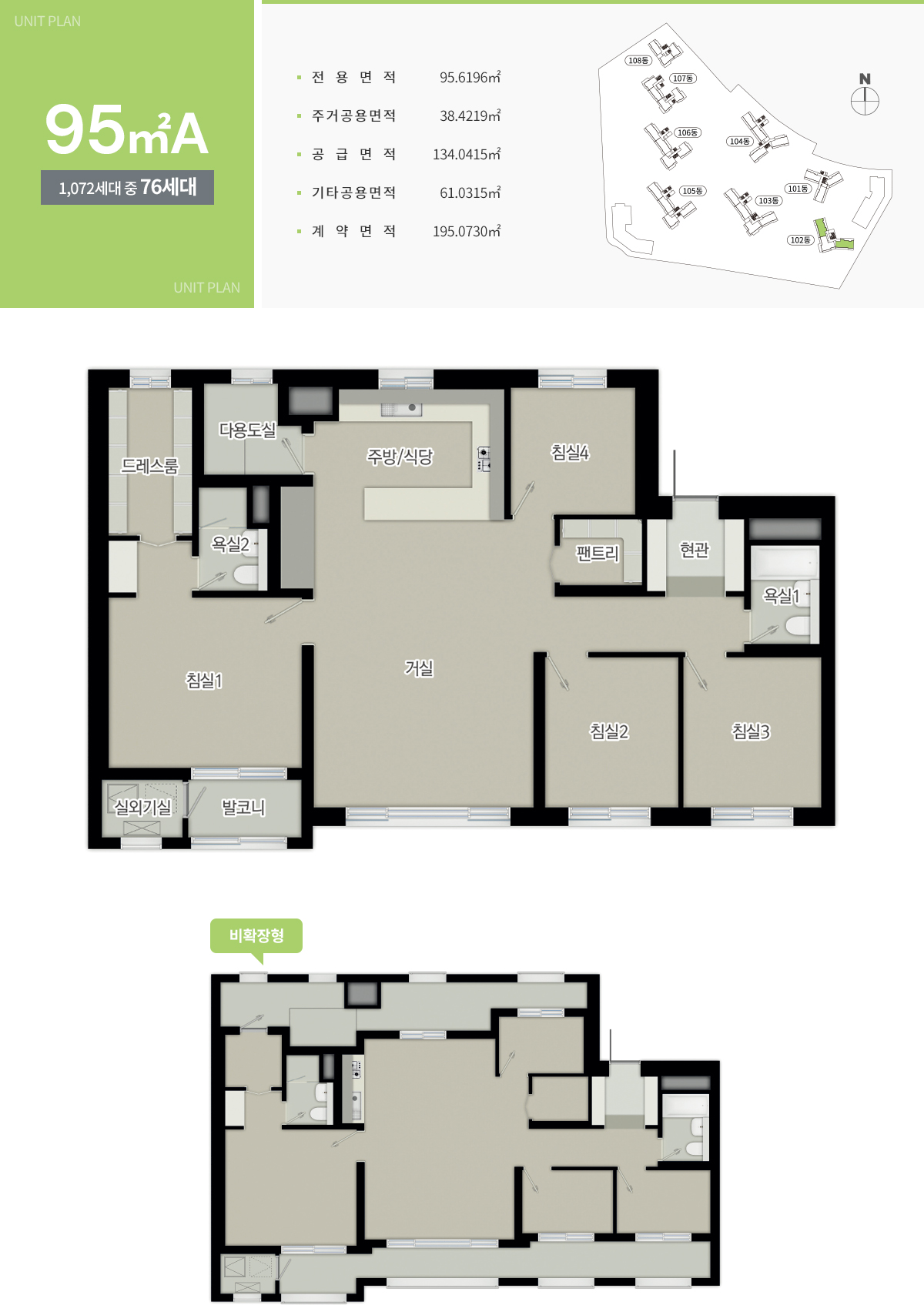 95A Type이 84A Type을 평형대에 맞게 키운 것이라면 95B Type은 84 Type을 평형대에 맞게 사이즈만 비례하여 키웠습니다. 동일한 평면 구조입니다.