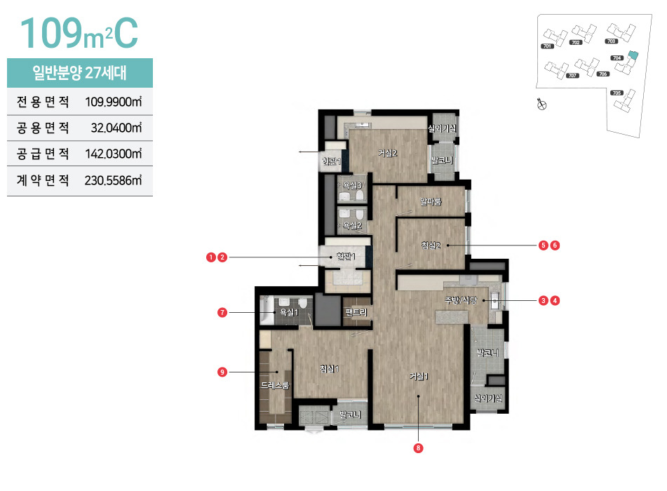 나머지 주인세대는 방하나가 없어지고 방하나가 작은 알파룸으로 변경된 것 외에 다른 변화는 없고 그대로 109B Type과 동일합니다. 단 공용욕실이 분리세대를 위한 욕실로 분리되면서 샤워부스가 없어진 점은 아쉬움이 있겠습니다. 분리된 세대와 알파룸이 맞닿은 벽체가 가변벽체인 것 같은데 생활 소음이 발생하지 않을까 우려되는 부분이 있습니다.