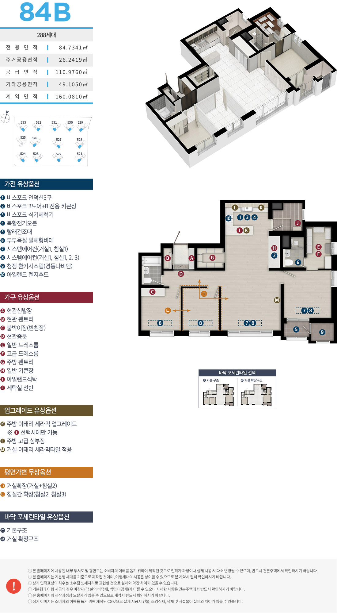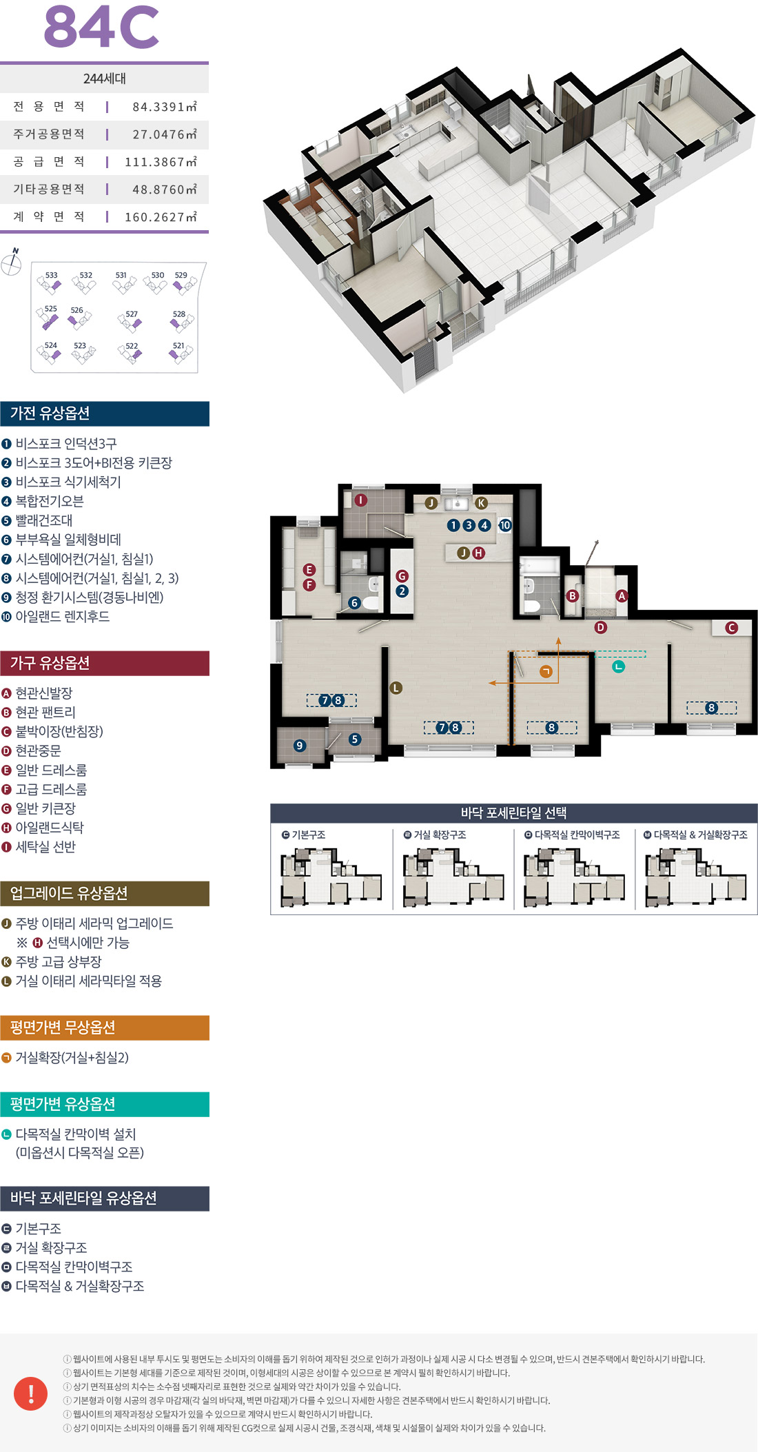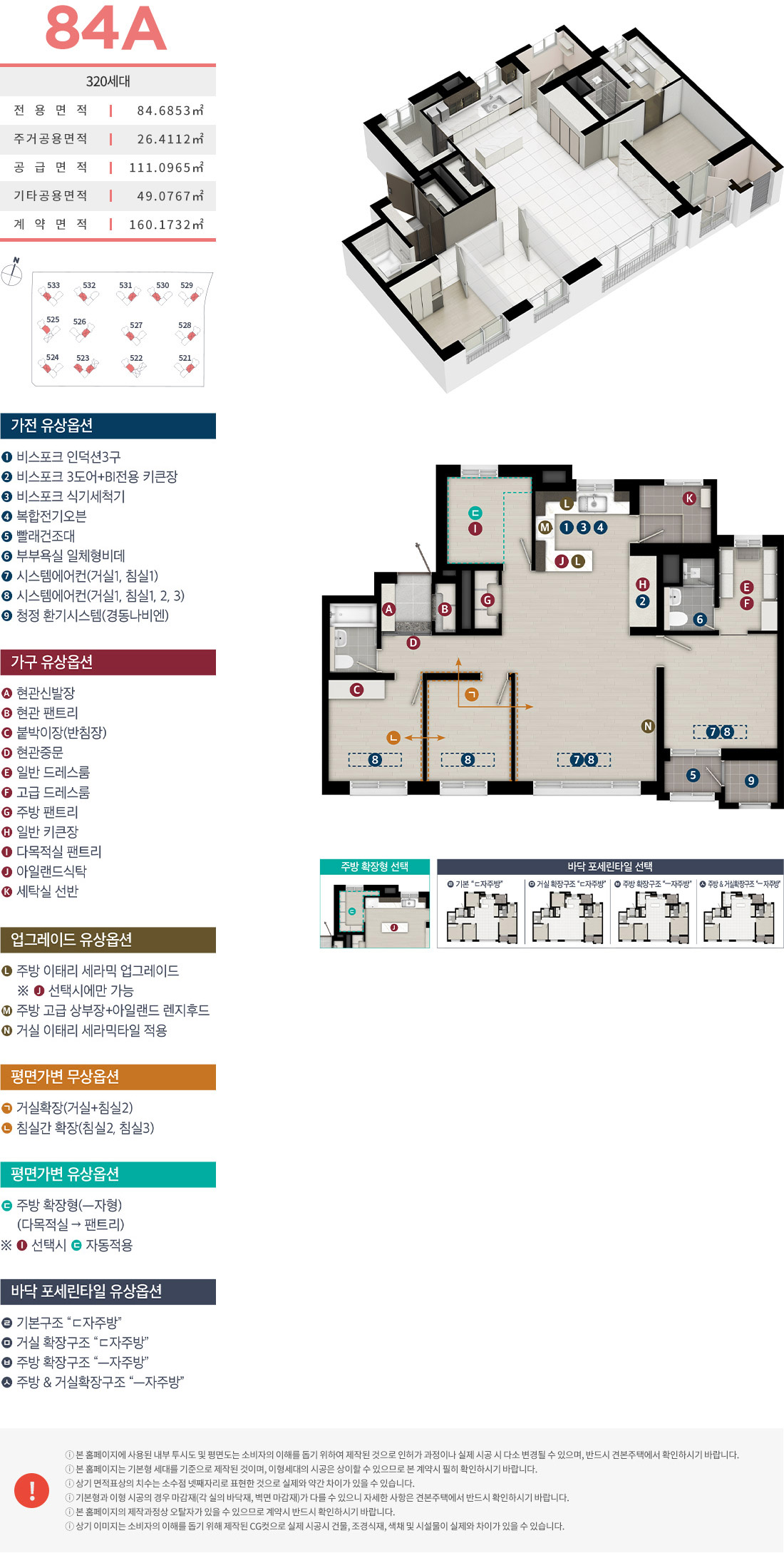 84A Type과 마찬가지로 거실 확장 옵션을 통해 거실과 침실 2를 통합하여 개방감 높은 와이드 한 거실 공간을 연출할 수 있습니다. 길이가 조금 짧을 뿐 침실 2,3의 폭에 맞먹는 다목적실을 제공하고 주방 확장형 옵션을 통해 이 다목적실 공간을 팬트리와 개방감이 뛰어난 와이드 한 주방구조로 선택이 가능합니다. 현관도 흔히 적용되는 양측 신발장 대신 한쪽을 팬트리 구조로 적용하여 활용성을 높였습니다. 화장실, 세탁실은 무난합니다. 주방창이 커서 맞통풍에 의한 환기효과도 뛰어나 보입니다.