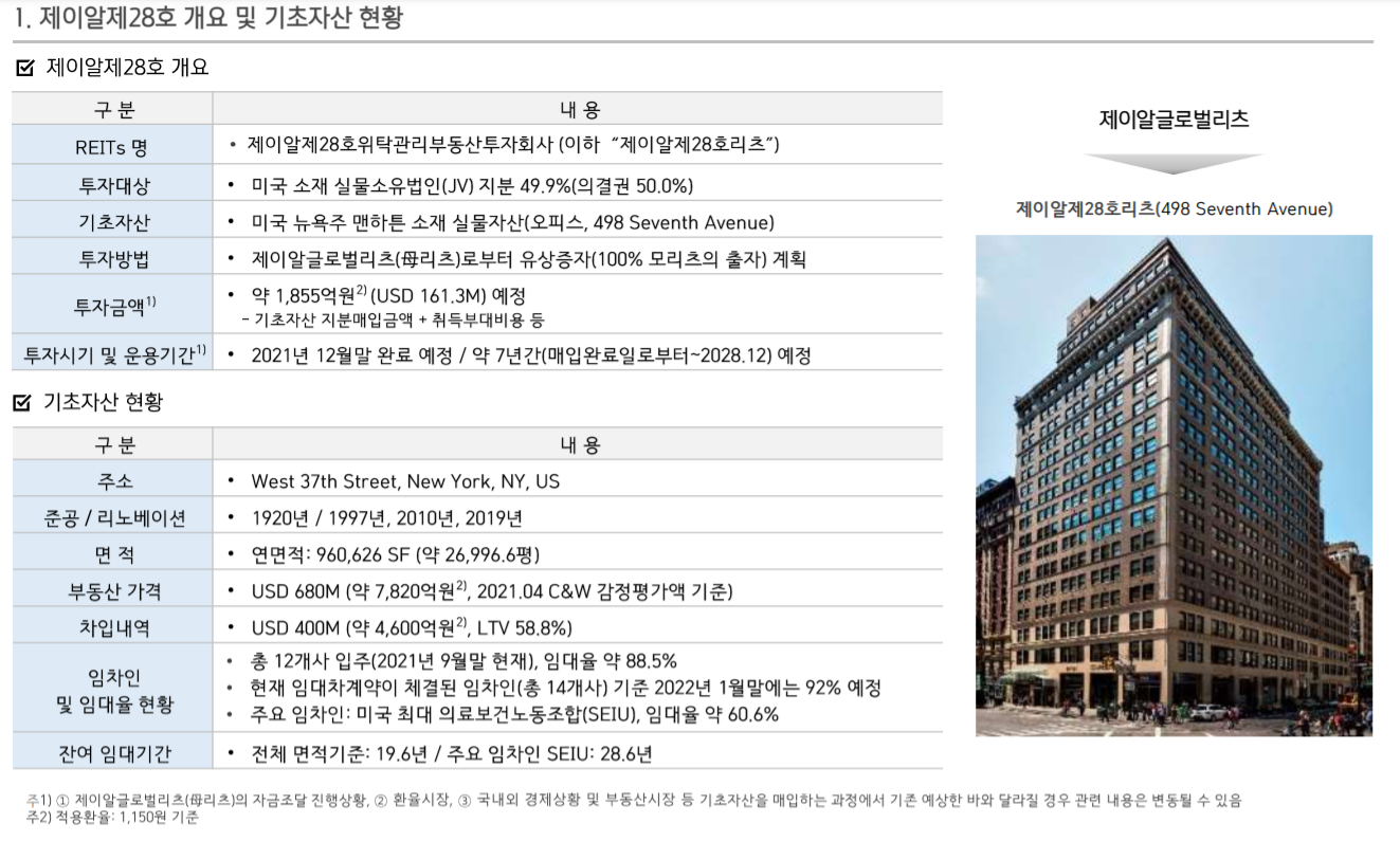 제이알글로벌리츠는 회사채 700억 원과 공모자금과 추가 금융기관 차입 1200억 원가량을 조달하여 자회사에 증자에 참여하고 이 자금으로 '제이알 28호'가 미국 뉴욕 맨해튼 498-7번가 사무용빌딩 지분 49.9%를 사들이는 방식입니다.