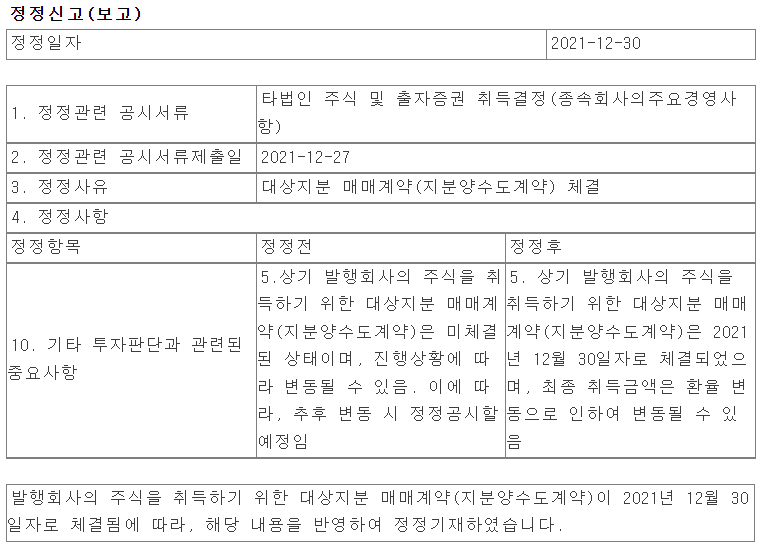 퇴직연금/IPR로 투자중인 제이알글로벌리츠가 2021.12.30일 타법인출자 관련 기재정정 공시를 냈습니다.