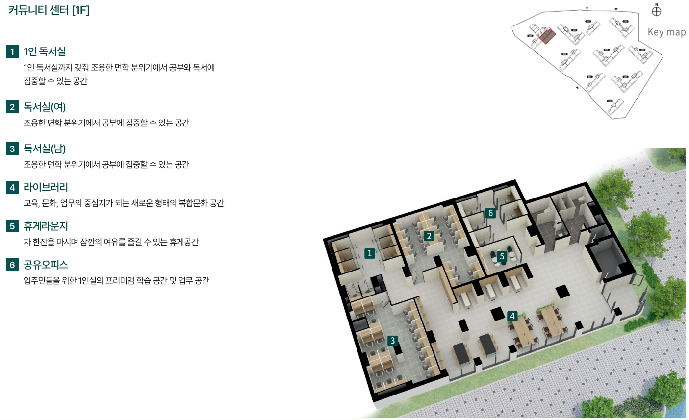 1000세대 정도의 중대형 단지인데 기본적인 커뮤니티 시설 외에도 게스트하우스, 스카이라운지, 휴게라운지, 공유오피스등 다양한 커뮤니티 특화시설을 추가로 제공합니다.
