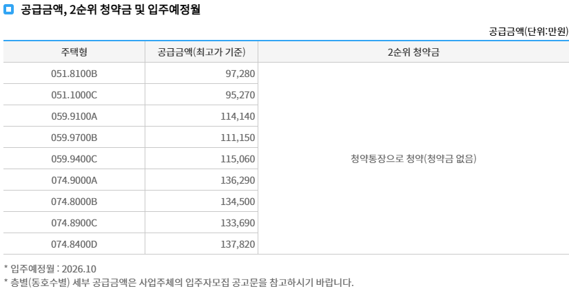 전용면적 74m2(29평~30평형) 기준 약 13억7천만원으로 계약금 10%, 중도금 3회에 각 20% 씩 60%, 잔금 30% 납부조건입니다. 현재 공사 중으로 입주일자가 2026.10월로 기간이 짧아 중도금은 20% 3번 납부하게 됩니다. 발코니 확장 비용도 같은 74m2 기준으로 약 2000만 원을 상회하여 동 평형대 신축보다 조금 비싼 편입니다.