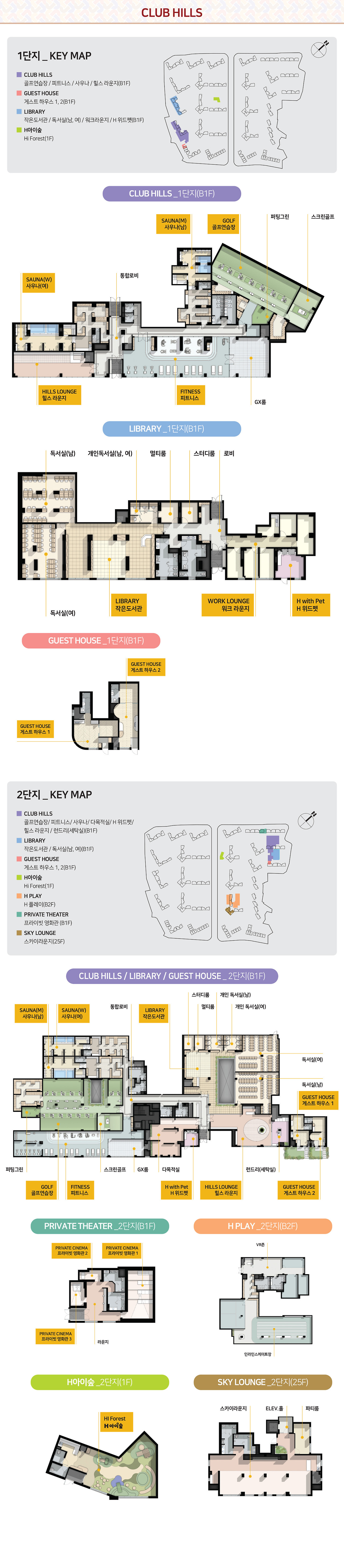 대단지 아파트 답게 다양한 커뮤니티 시설을 제공합니다. 기본적인 커뮤니티 시설 외에 사우나, 라운지, 게스트하우스, 3개의 프라이빗 영화관과 아이숲(1단지), 인라인스케이트장, VR존과 스카이라운지(2단지) 등의 특화된 커뮤니티 시설이 추가됩니다. 커뮤니티 시설은 1단지, 2단지로 나뉘어서 각각 제공됩니다.