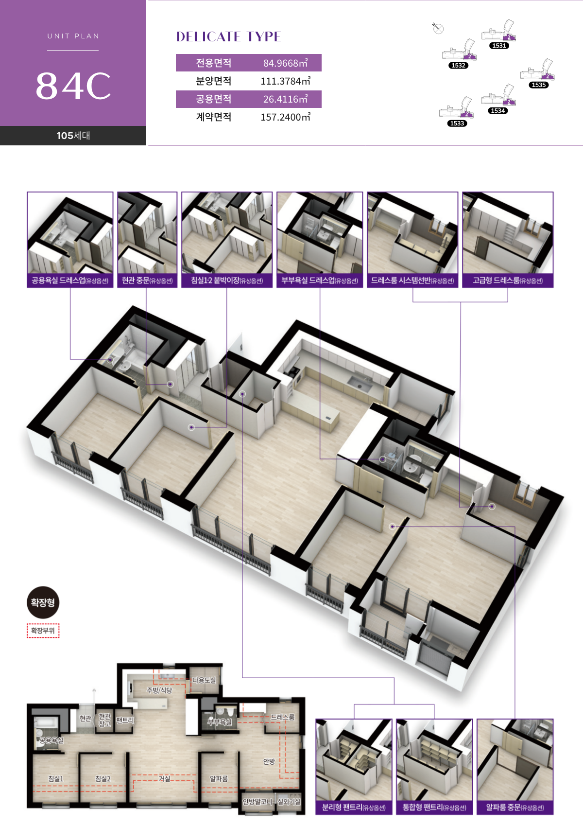 전면 폭을 늘려 알파룸까지 전면에 배치한 판상형 5Bay 평면입니다.