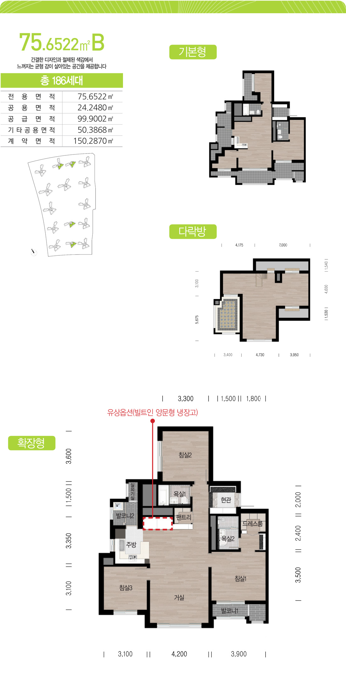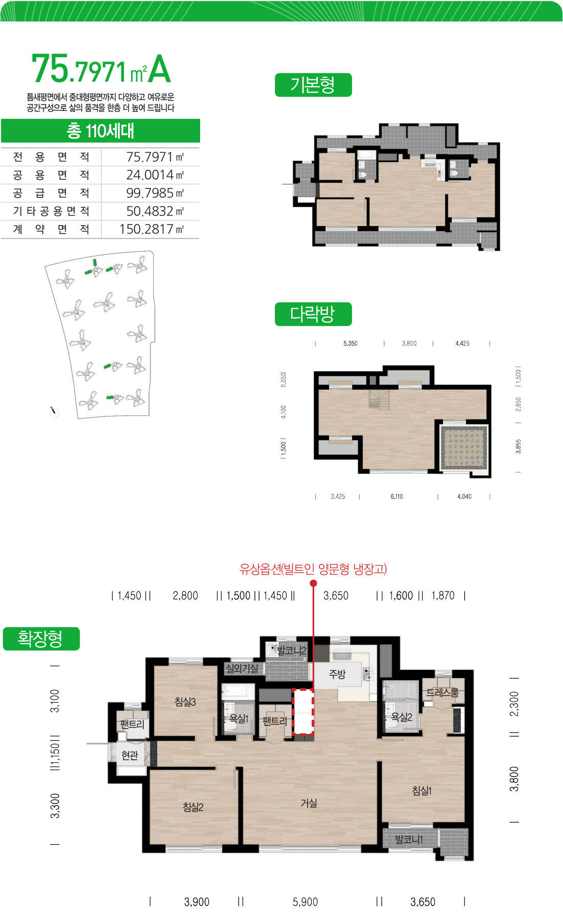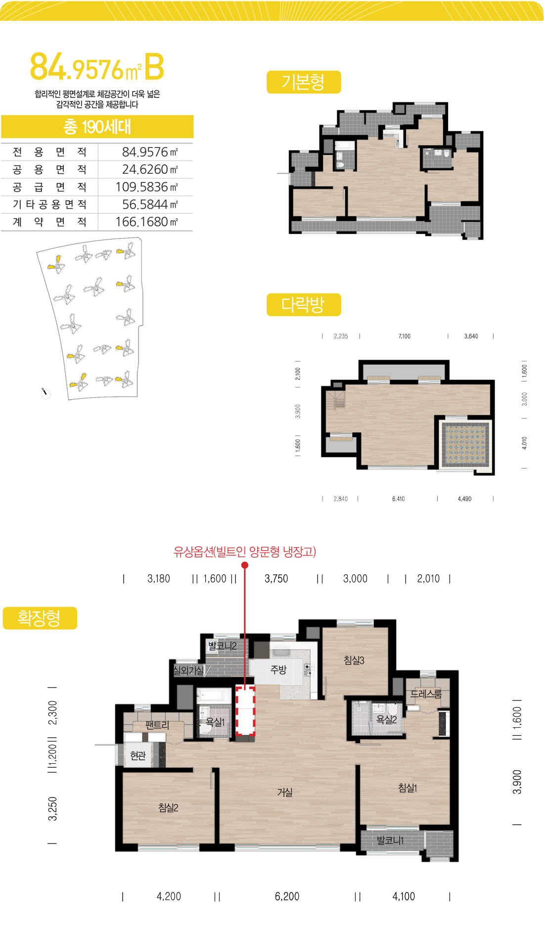75B와 마찬가지로 안방과 거실이 전면을 향하는 일반적인 타워형 평면에 방 하나를 같이 배치하여 3 Bay 타워형으로 구성한 평면입니다.75B Type과 거의 같은 구조로 사이즈만 비례하여 키운 구조입니다.