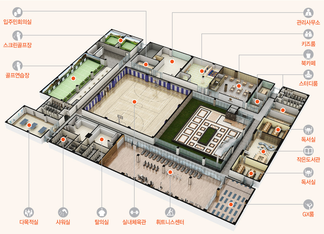 건설사가 각 잡고 커뮤니티 특화에 힘을 주어서 실내체육관, 스크린을 포함한 실내 골프연습장, 남녀독서실, 작은 도서관, 헬스클럽, 북카페, 스터디룸, 다목적 실등 다양한 커뮤니티 특화 시설을 갖추고 있습니다.