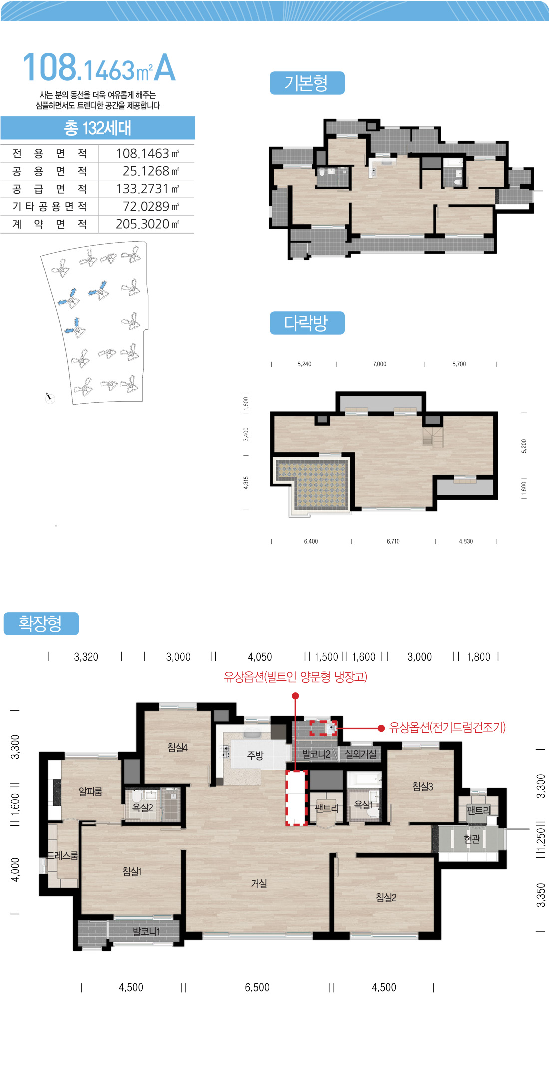 판상형은 광폭 거실을 적용하고 타워형은 3Bay로 적용한 차별화된 특징이 있으며 모든 화장실에는 창이 없는 것 또한 특징입니다. 또 평형별로 각 동의 최상층 평형에는 다락방 공간을 제공하여 스페셜 한 특화 공간을 제공합니다.