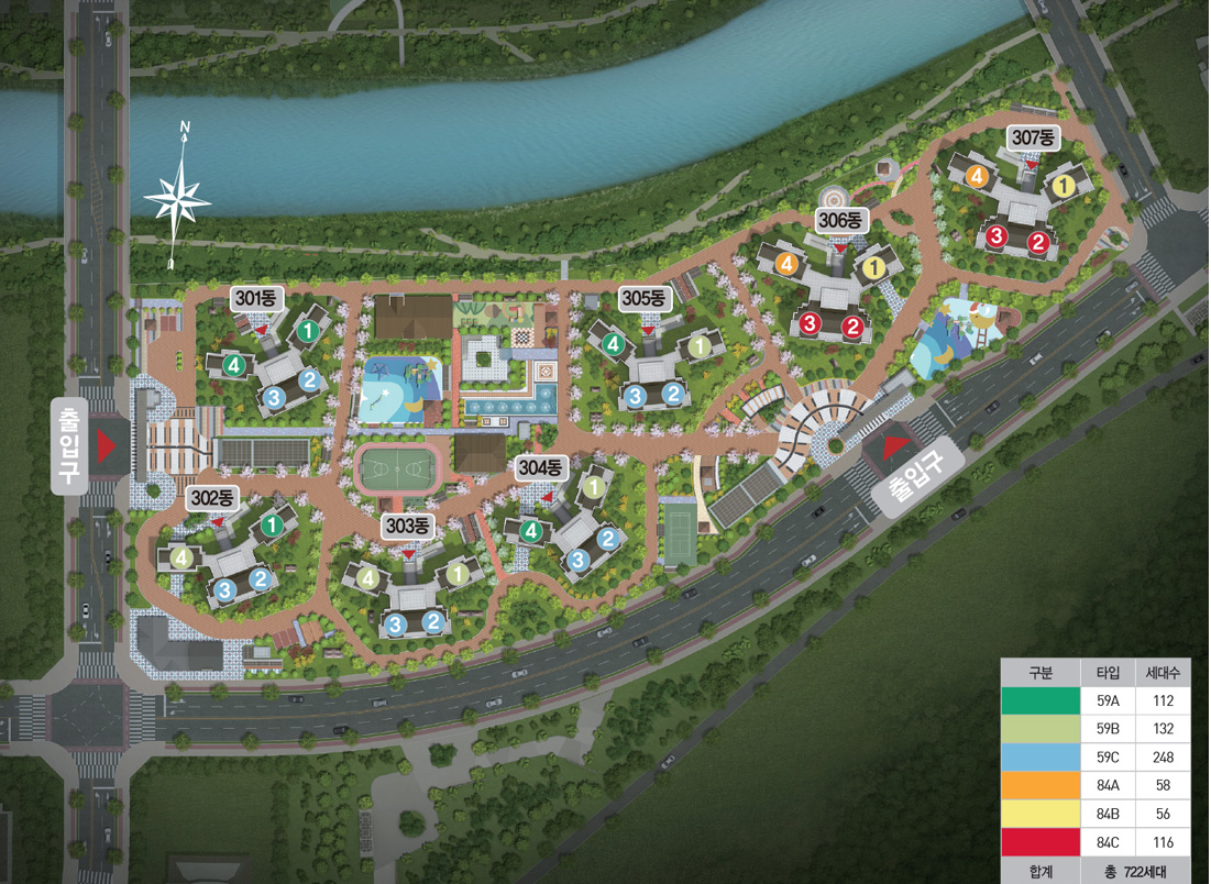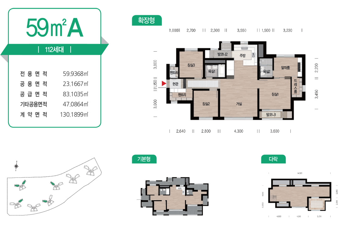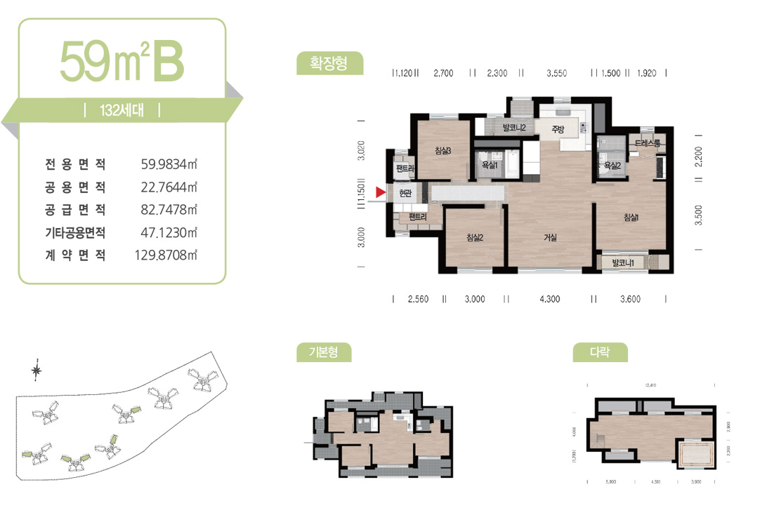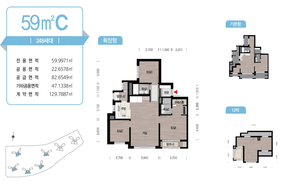 먼저 분양한 1,2차와 동일한 평면 구조로 판상형 타입에는 광폭 거실 적용, 타워형 타입은 3 Bay 적용, 전 평형 화장실에 창이 없는 구조 모두 동일하며 평형별로 각 동의 최상층 평형에는 다락방 공간을 제공하는 것도 동일합니다. 1,2차와 달리 전용면적 59m 2의 세대도 포함하고 있으며 이미 적용한 74,84 Type을 평형에 맞게 사이즈만 비례하여 줄인 동일한 평면을 적용하였습니다.