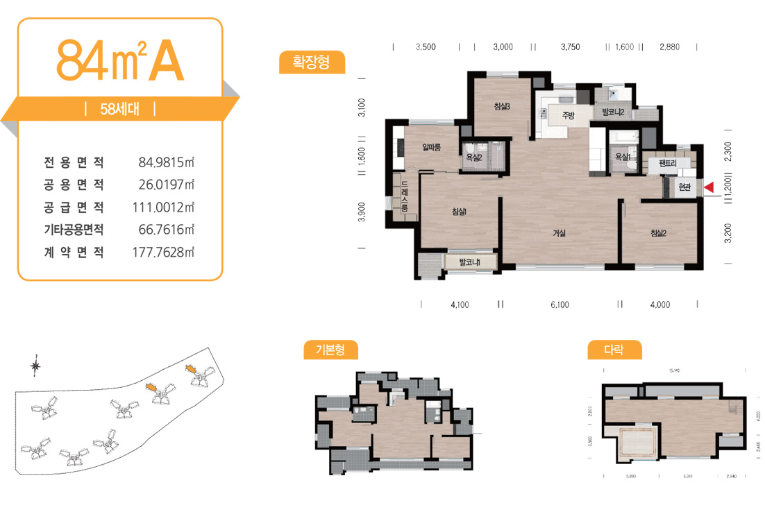 안방과 거실이 전면을 향하는 일반적인 타워형 평면에 방 하나를 같이 배치하여 3 Bay 타워형으로 구성한 평면입니다. 1,2차의 84A Type과 동일한 평면입니다.