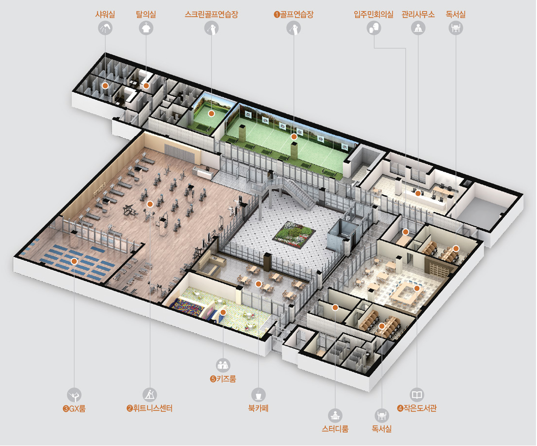 1,2차에 비해 단지 규모가 비교적 작아 커뮤니티 시설도 1,2차에 비해 특화된 시설물이 보이진 않지만 스크린 골프연습장을 포함한 실내 골프연습장, 남녀독서실, 작은 도서관, 헬스클럽, 키즈룸, 북카페 등 모자라지 않는 수준의 커뮤니티 시설을 갖추고 있습니다.
