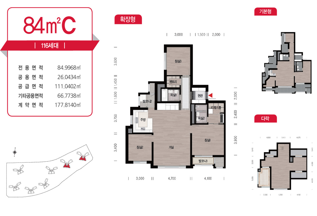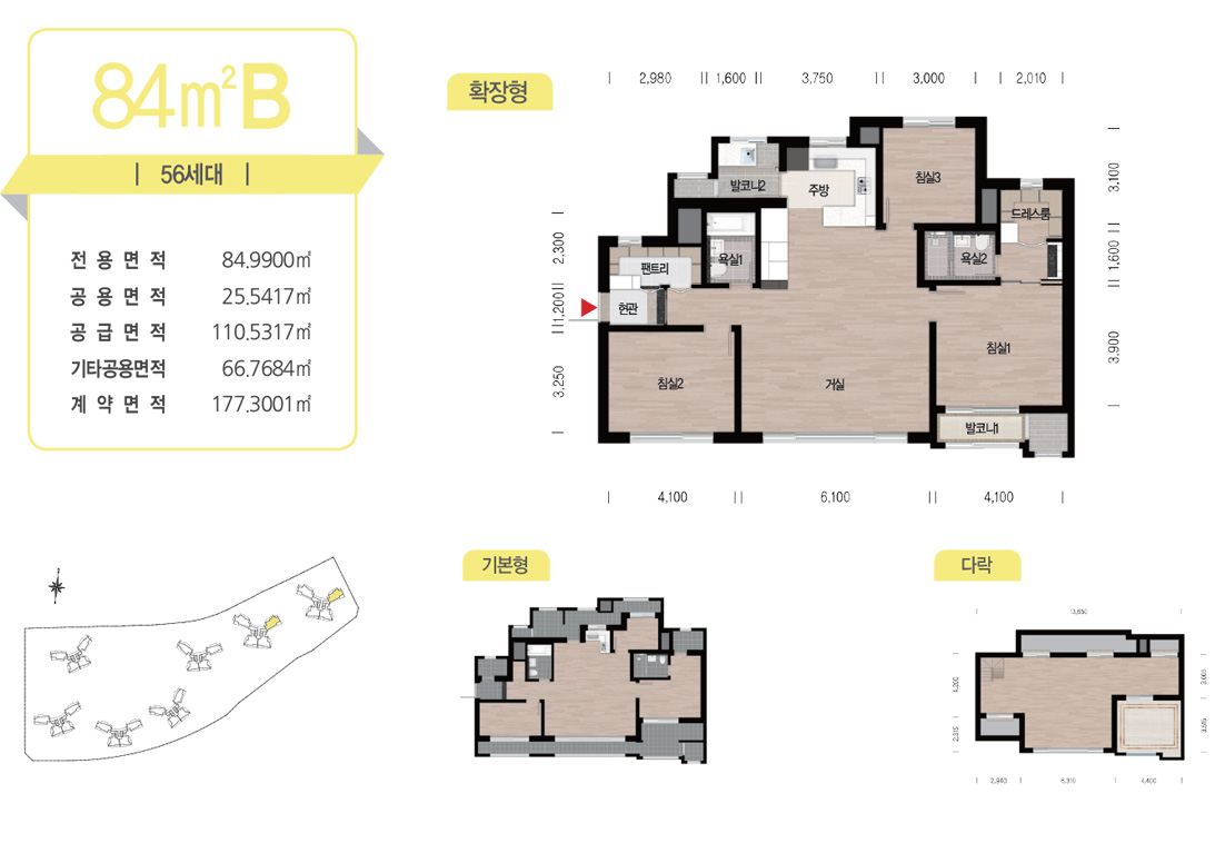 광폭 적용 거실과 전면 침실 1,2의 폭을 대폭 늘린 4 Bay 판상형 구조의 폭을 가진 3 Bay 평면입니다. 1,2차 84B Type과 동일한 평면입니다.