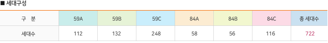 세대 구성은 아래와 같으며 전체 세대가 대다수 남향, 일부가 남향에 가까운 남동향으로 골고루 배치되었으며 다른 검단 신도시 신축 아파트들과 같이 동 간 거리가 넉넉하여 일조권을 침해받는 동호수가 상대적으로 적습니다.