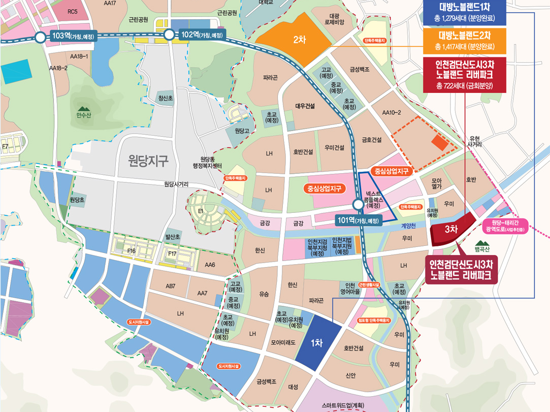 초등학교 예정 부지로 볼때 도보 통학이 가능한 거리입니다. 중심상권까지는 도보 10분 정도로 거리가 있어 상권 이용에 있어 생활패턴에 따라 조금 불편할 수도 있습니다. 계양천 수변공간을 끼고 있어 자연친화적인 쾌적한 생활환경이 되리라 생각됩니다.