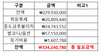 결론적으로 2025.3월 입주 시 비용은 최소 334,240,780원이 필요하며 부수적으로 이사비용/새 아파트 입주에 따른 가전/가구 교체비용을 추가로 감안하시면 됩니다.