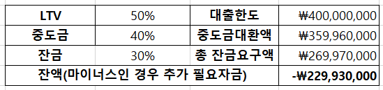 또한 LTV 한도가 나온다 하더라도 개인의 소득이 DSR 규제에 적용된다면 대출한도가 달라지므로 이 경우 추가적인 현금 혹은 외부 수혈이 필요할 수도 있습니다.