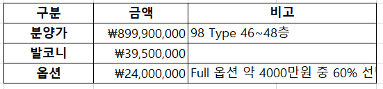 잔금 총액 산출은 시세가 분양가 기준인 경우로 분양가 이하로 떨어진 경우는 극히 드물어 해당 상황은 고려하지 않았으며 시세가 오르면 대출한도가 커져서 위의 최소 필요 자금이 비례하여 줄게 됩니다만 98 Type의 경우 대출 한도가 Max를 채워서 현제 규제 상태에서는 의미 없는 가정입니다.