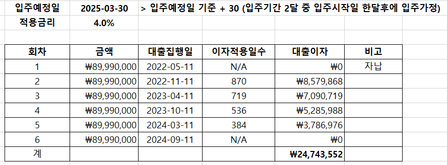 송도 아크베이는 공사기간이 긴 편으로 이에 따라 중도금 대출 기간이 길어져 중도금 대출이자가 더 많이 발생합니다. 타 단 지 사례와 최근 금리 인상 추이로 보아 적용금리를 4.0%로 가정하였으며 이자는 일수로 계산되고 중도금 전체 금액이 한꺼번에 대출하는 것이 아니라 회차별 기간을 두고 집행되기 때문에 하루치 이자를 계산해서 적용일수를 산출해서 최종 액수를 구해야 합니다. 산출된 중도금 대출이자는 아래와 같습니다.
