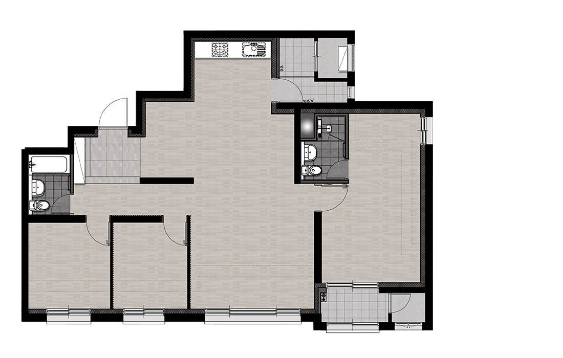 주방의 폭이 조금 좁아 보여 조리 공간이 넉넉지 못하다는 느낌이 듭니다. 식탁 자리는 현관과 이어지는 공간을 어떻게 하냐에 따라 다이닝룸 수준의 크기를 확보 가능할 것 같습니다. 배치 구조상 주방이 다른 세대와 맞닿아 있어 주방창이 없습니다. 맞통풍에 의한 환기는 아쉽고 조리 시 후드에만 의존해야 하는 점도 아쉽습니다.
