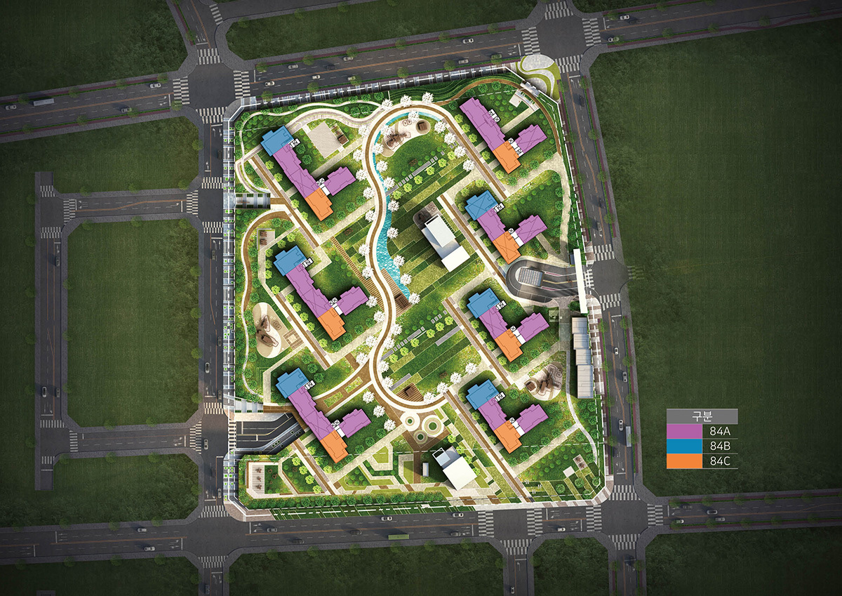전체 84A , 84B, 84C 세 가지 Type이며 이번에 사전청약으로 공급하는 세대수는 84A Type 447세대 , 84B Type 147세대 , 84C Type 178세대입니다. 전체 동배 치를 보면 남서향, 남동향 세대로 동 배치가 적절하고 동 간 거리가 넉넉하여 동 간 간섭에 의한 일조권 영향은 적어 보입니다.