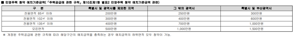 청약예치금 기준은 아래와 같으며 입주자 모집공고일 이전에 기준이 충족되어야 합니다.